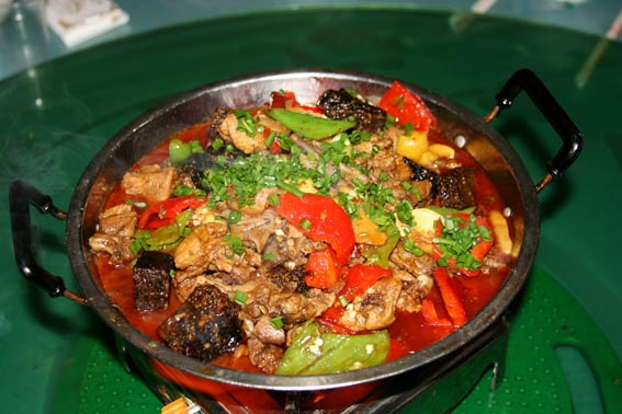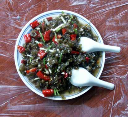 【 酸辣子炒沙蘿菇 】 當?shù)卮合募居旰螅筋^巖石壁上生長的墨綠色地菇——地衣(本地名為沙蘿菇),采集后用清水反復(fù)多沖洗幾次。再用壇子腌的酸辣椒和大蒜一起炒熟,出鍋后灑些許香蔥即成一道色、香、味俱全的地方特色小吃。