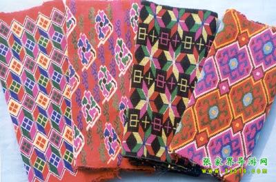![]() 織錦。又名“西蘭卡普”、“土花鋪蓋”,為土家族傳統(tǒng)工藝品之一,是森林公園工藝品廠的主要產品??楀\是在特制的本質織機上以錦紗為經、五彩絲線為緯、手工提花織成。以其質地厚實、堅韌,色彩鮮艷,格調古樸,流暢生動著稱。圖案有花草、鳥獸、生產、生活、幾何、字樣等種類。為舊時土家姑娘必備嫁妝之一。據(jù)考證,早在漢代,土家織錦就作為方物貢入漢室宮廷。20世紀后,土家織錦曾漂洋過海至日、美、英等國展出,并作為禮品,被國家領導人贈送給外國元首及政府官員,如今織錦以壁掛、枕巾、沙發(fā)墊、桌圍、提袋、服飾等多種式樣遠銷世界各地。