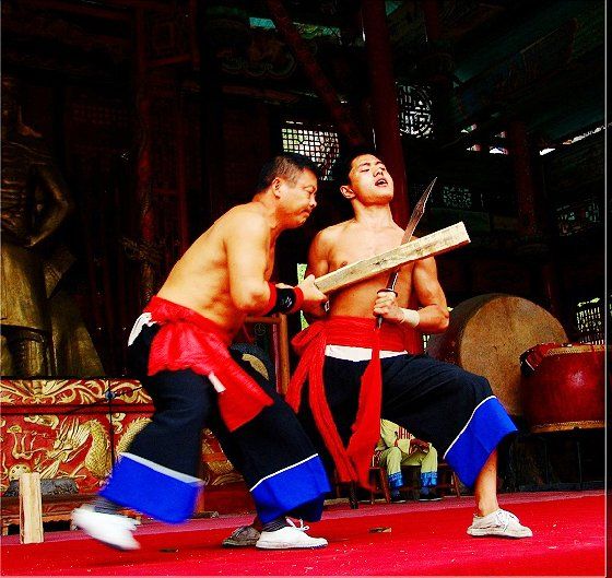 大庸氣功 大庸氣,堪稱武林奇葩,曾為祖國贏得聲譽,海內(nèi)外享有極主名望。 大庸氣功是大庸各民族特別是土家族傳統(tǒng)體育項 目之了,分健體氣派、武術(shù)氣功兩類。前者有“返還 功”、“馬王推氣功”、“少林達摩醫(yī)療保健氣功” 等;后者有靜坐、壁虎、靈子、二指彈、碎石、松靜 、硬氣、五禽、五陽功等,尤以硬氣功著稱。大庸硬 氣功,歷史悠久,漢代相單程,明代覃后,清代劉明 燈,當(dāng)代湯子模、周鐵鞭、杜心武、趙繼書等都具有 超人硬氣武功。大庸土著民族在漫長的反征服、反壓 迫斗爭,博采武當(dāng)、少林南北派、昆侖派眾家武林精 華,創(chuàng)造出獨此一家的大庸硬氣功。 據(jù)傳,大庸硬氣功鼻祖是楚國鬼谷子?!?a class="insidelink" href="http://www.powuer.com/cityinfo/15580531721.html" title="永定區(qū)">永定縣 志》有關(guān)鬼谷子隱居天門山鬼谷洞潛心學(xué)《易》、傳 授方術(shù)的記載。到清代有武林高手朱茂嶺,隱居三岔 村北芭蕉灣洞,研究鬼谷氣功之術(shù),后收西溪坪胡口 子、余世萬(即“余通人”)為徙,傳其衣缽。余通 人將武術(shù)氣功系統(tǒng)整理,發(fā)揚光大,播名于世。 新中國成立后,黨和政府十分重視民間氣功發(fā)掘 整理,并正式列為體育項目加以普及發(fā)展,今日大庸 市習(xí)練硬氣功達數(shù)萬人眾。永定區(qū)官黎坪村世有“硬 氣功之鄉(xiāng)”盛譽,該村男女老幼,練功已蔚成風(fēng)氣, 其武師趙繼書,1979年先后參加全省和全國武術(shù)大賽 ,均獲一等獎,受到國家體委重視,同年7 月趙繼書 專程到北京給中央領(lǐng)導(dǎo)同志匯報表演。嗣后,隨同中 國武術(shù)代表團和國家領(lǐng)導(dǎo)人先后兩次出國,到盧森堡 、意大利、比利時、羅馬尼亞、馬其他和東南亞等國 家訪問。他表演的臥刀碎石、頭頂開石、雙鳳灌耳、 頭碰石柱、叉尖推磨等精彩節(jié)目,博得外國友人好評 。盧森堡一位榮獲國家獎牌的武士,看了表演后連夜 來到中國大使館,將自己珍藏多年的獎牌贈送給他; 盧森堡國王主動熱情走上臺與趙繼書熱情擁抱,連連 稱贊:“了不起!了不起!國際氣功大師!”并把珍 藏紀(jì)念章一枚贈送給趙繼書。一位法國朋友十分贊賞 說:“中國的氣功,稱為全人類的寶貴財富,是有科 學(xué)道理的。”自此,大庸硬氣功譽滿全球。湖南瀟湘 電影制片廠專門拍攝了彩色紀(jì)錄片《大庸氣功》。 大庸硬氣功共有二十多個項目,最有影響的是: 腹臥鋼叉 由二人在地面扶住一根叉尖朝上的三 股鋼叉,叉尖猁鋒利,然后一個俯身叉尖,尖抵腹部 ,待其四肢平展懸空,扶叉二人轉(zhuǎn)動鋼叉,謂之推磨 。表演時,要求臥叉者運氣于腹,氣意集中,稍有大 意,叉即穿腹而過。 臥刀破石 先固定兩把大刀,刀口朝上,臥刀者 運氣后,由其他人抬臥于刀口上(有仰臥、俯臥兩種) ,然后在臥刀者腹部或背部置一碩大石條(約數(shù)百斤) ,一人或兩人輪大鐵錘狠擊石條直至斷裂破碎為止。 釘?shù)洞财剖?地上倒一層碎玻璃片,一人仰臥其 上;然后腹上置釘床,又一人仰臥釘床上,再于第二 人腹上置釘床,第三人仰臥刀床上,腹部上壓一塊數(shù) 百斤大條石,由人掄錘狠砸,至石破為止。 銀槍刺喉 用一根兩頭安有鋒利槍頭的鋼槍,抵 置兩位表演者喉部,然后相對發(fā)力,至槍桿抵成彎弓 形而喉部安然無恙。 徙手?jǐn)嗍?表演者將堅滑如鐵一塊卵石置于石凳 (地)上,然后運氣于掌或指擊斷(碎)卵石。 踢腿斬石 表演者運氣于腿,以腿踢斷石條。一 般可踢斷15公分以上厚度的麻石條或青石條。 胸部打刀 將鋒利大刀刃口置于胸部肌肉上,用 一根拳頭粗木棒猛擊刀背,至棒斷而胸部無傷。 新中國成立以來,大庸民間武術(shù)與民族體育逐漸 融為一體,發(fā)揮著提高人民身體素質(zhì)、弘揚中華武術(shù) 傳統(tǒng)和增進國際友誼重大作用。除硬氣功外,還有數(shù) 十種武術(shù)形式散見于民間武術(shù)體育活動之中。如打飛 棒、扭扁擔(dān)、抵搭斗杠、擠油渣、甩抱腰、舉石鎖、 板牛角(一種斗牛形式)等等。其特點是因地制宜, 不分場地,凡田園地角院壩集鎮(zhèn),都是習(xí)武練功、開 展活動的處所,頗具泥土氣息。擬或以生活中某些動 作和動物的某種形態(tài),稍加模仿演繹,便成某一獨特 武術(shù)形式。如天門武術(shù)功夫大師余道人所創(chuàng)造的“宮 天梳”、“巖燕樸天門”等;也有就地理特點創(chuàng)造某 種武功形式的,如“蕩藤”等。 以上部分圖片均來自互聯(lián)網(wǎng),出處不詳,請作者與本站聯(lián)系。 |