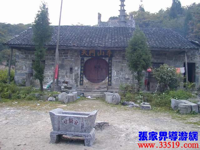 (天門山寺)天門山寺最早建于唐代,古稱云缽庵、靈泉院、嵩梁堂,明代時,因擇址不當而屢遭風摧又常遭水荒,才將天門山寺從東部山頂遷移至此。以前這里古木參天,濃蔭蔽日。古寺門楣上刻有“天門仙山”四字,大門兩邊的對聯(lián)是:“天外有天天不夜,山上無山山獨尊”,傳為李自成部將野拂撰書。進門為大佛殿后面有觀音堂,兩邊六間平房,最后一棟是祖師殿,規(guī)模宏大。民間概括為“三進堂、六耳房,磚墻鐵瓦鍋如壙”。山寺原建筑十分講究,飛檐翹角,雕龍畫鳳,并塑有佛道神像菩薩等。還有大鼓一面,千斤大鐘一口,一座七級石塔和一個大化錢爐。據(jù)碑刻記載,自清乾隆至民國五年的163年間,天門山寺共修葺過七次,香火曾盛極一時,湘鄂川黔邊境十多個縣的信徒絡繹不絕,都來這里進香拜佛。現(xiàn)天門山旅游股份有限公司正在大規(guī)模地修復天門山寺,昔日的繁華又將重現(xiàn)。