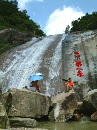 水簾洞瀑布源頭,在紫蓋峰的泉水。三支泉水匯集一起,流入水簾洞上方谷地。谷地闊三丈,原是梁朝的九位真人白日飛升的棲息之地,后建造九仙觀。九仙觀附近有太陽泉、洗心泉、洞真源、仙人池等。相傳泉水深不可測。泉水從石壁上飛流直瀉,發(fā)出雷鳴般的聲音,聲傳十里。明朝張居正游此地后說:“瀑泉灑落,水簾數(shù)疊,掛于云際,垂如貫珠,霏如削玉”。確實(shí),它從絕壁上噴瀉下來,寬達(dá)三太,高五十余米,瀉珠濺玉,仿佛一幅巨大的白布簾,在石壁當(dāng)中被亂石嶙巖擋住,然后再從石縫里屈曲折射,跳躍出來,滿谷水花四濺,閃爍著晶瑩奪目的光彩。水簾絕壁下的碧潭,天上的云彩和兩邊的蒼翠的山巒,構(gòu)成一幅美麗的山水畫。明朝張居正作《水簾洞》一贊道:“誤疑瀛海翻瓊浪,莫擬銀河倒碧流;自是湘妃深隱處,水晶簾掛五去頭”。這首詩可說是寫出了水簾洞的光、聲、影三絕的奇景了。