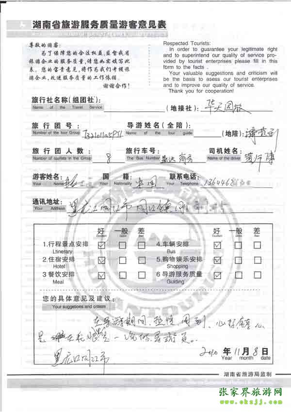 2010年11月8日黑龍江張先生一行8位旅游質(zhì)量反饋:導游熱情周到,有孝心,是一流導游