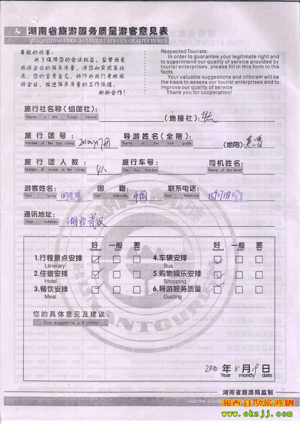2010年4月19日湖北武漢向先生旅游質(zhì)量反饋