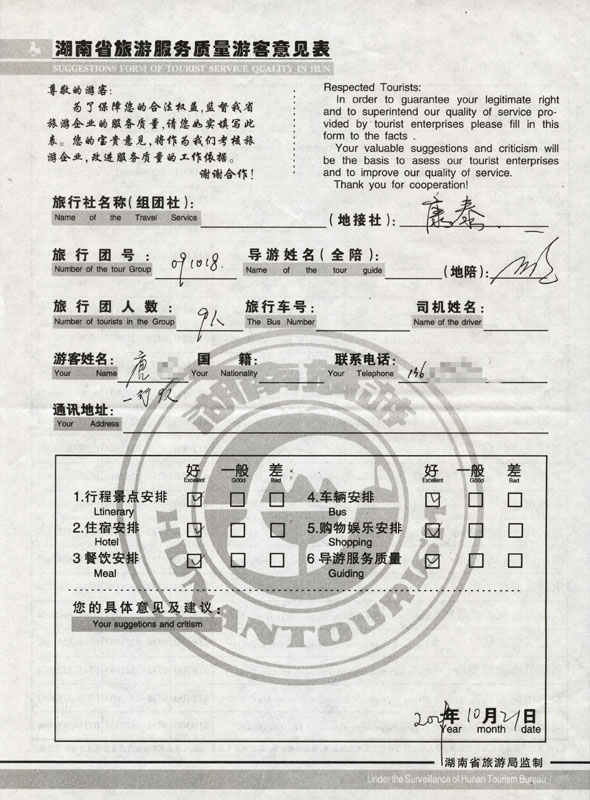 2009年10月18日唐先生一行9人接待質量反饋單: