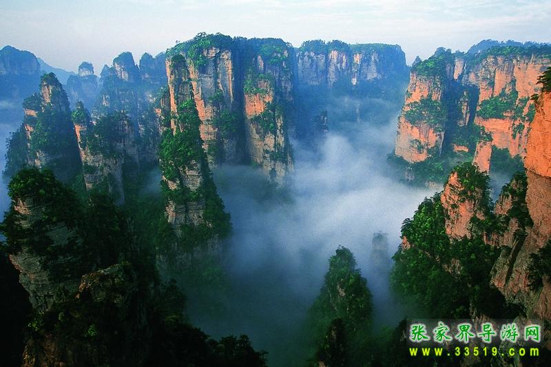 第二天早上,我們參觀了袁家界的風(fēng)景,其中最有名的當(dāng)然數(shù)天下第一橋,這是由兩座巖石山的山頂自然生長(zhǎng)在一起,非人所能為也。天下第一橋的稱號(hào)當(dāng)之無(wú)愧啊。當(dāng)然在袁家界,后花園也是不能不看的。張家界號(hào)稱“峰三千,水八百”,在這里你就能明顯的感覺(jué)到這句話的前半句是那么的實(shí)在??赐陱埣医绲暮诵脑医纾覀兂塑嚨搅?a class="insidelink" href="http://www.powuer.com/scenic/zjjjq/1529295057.html" title="天子山">天子山(張家界景區(qū)內(nèi)的最高的地方)。玩了賀龍公園、御筆峰、仙女散花、西海、石船出海、仙人橋、天子廟、十里畫廊、一步難行。不巧的是,那天山上下了一點(diǎn)陣雨,雨后一條彩虹掛在天上,更重要的是山上起了一點(diǎn)霧,使整座山都籠罩在霧中,若隱若現(xiàn),看上去就象是在云海中,好象老天特地配合我們似的,難得一見的西海等正好被我們趕上了。江導(dǎo)告訴我們,這樣的機(jī)會(huì)是很難得的,可能是張家界為了感謝我的再次到來(lái),給了我一個(gè)特別的禮物吧。我大笑。晚上趕到昨天住的地方去住宿。不提。